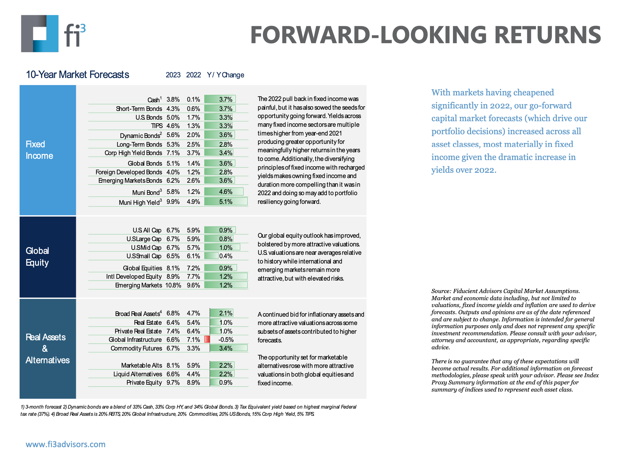 With markets having cheapened significantly in 2022, Fi3's go-forward capital market forecasts (which drive our portfolio decisions) increased across all asset classes, most materially in fixed income given the dramatic increase in yields over 2022.